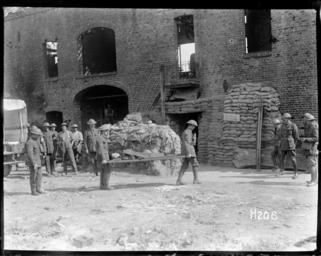 | Keywords: the great war thegreatwar great war greatwar world war one worldwarone world war i worldwari wwi first world war firstworldwar new zealand expeditionary force newzealandexpeditionaryforce nzef sandbags stretcher date:year=1917 date:month=august date:day=25 photographer:name=henry armytage sanders photographer:name=henryarmytagesanders geo:locality=warneton blackandwhite monochrome photo border surreal outdoor black and white Stretcher bearers carry a wounded soldier to the patients' entrance of the regimental aid post, Warneton during World War I. Men and officers look on. Photograph taken 25 August 1917 by Henry Armytage Sanders. Inscriptions: Inscribed - Photographer's title on negative -bottom right: H206. Quantity: 1 b&w original negative(s). Physical Description: Dry plate glass negative 4 x 5 inches A regimental aid post at Warneton, World War I. Royal New Zealand Returned and Services' Association :New Zealand official negatives, World War 1914-1918. Ref: 1/2-012900-G. Alexander Turnbull Library, Wellington, New Zealand. natlib.govt.nz/records/22797558 Stretcher bearers carry a wounded soldier to the patients' entrance of the regimental aid post, Warneton during World War I. Men and officers look on. Photograph taken 25 August 1917 by Henry Armytage Sanders. Inscriptions: Inscribed - Photographer's title on negative -bottom right: H206. Quantity: 1 b&w original negative(s). Physical Description: Dry plate glass negative 4 x 5 inches A regimental aid post at Warneton, World War I. Royal New Zealand Returned and Services' Association :New Zealand official negatives, World War 1914-1918. Ref: 1/2-012900-G. Alexander Turnbull Library, Wellington, New Zealand. natlib.govt.nz/records/22797558 |