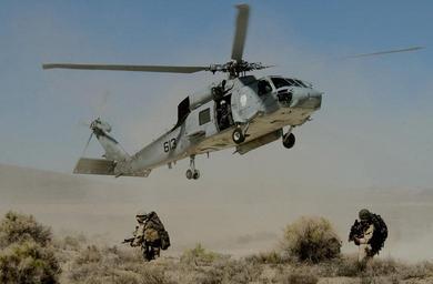 Keywords: SH-60F Seahawk helicopter departs delivering Navy SEAL desert