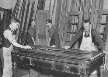 | Keywords: sunderland shipbuilding joiners shipyard workers shipyardworkers black and white photograph blackandwhitephotograph joiners shop joinersshop workers january 1948 january1948 industry maritime heritage maritimeheritage shipyard wall floor timber wood frame table drawer handle attentive concentration apron trousers shirt stripes waist coat waistcoat cloth scarf jumper overalls mark paint holding door legs unusual interesting abstract sir james laing & sons ltd sirjameslaingsonsltd blackandwhite people monochrome black and white Polishers at work inside a Joiners' shop, probably that of Sir James Laing & Sons, shipbuilders of Sunderland, January 1948 (TWAM ref. DS.JLT/5/4/2/4). Sunderland has a remarkable history of innovation in shipbuilding and marine engineering. From the development of turret ships in the 1890s and the production of Doxford opposed piston engines after the First World War through to the designs for Liberty ships in the 1940s and SD14s in the 1960s. Sunderland has much to be proud of. Tyne & Wear Archives cares for tens of thousands of photographs in its shipbuilding collections. Most of these focus on the ships – in particular their construction, launch and sea trials. This set looks to redress the balance and to celebrate the work of the men and women who have played such a vital part in the region’s history. The images show the human side of this great story, with many relating to the world famous shipbuilding and engineering firm William Doxford & Sons Ltd. The Archives has produced a short blog to accompany these images. (Copyright) We're happy for you to share these digital images within the spirit of The Commons. Please cite 'Tyne & Wear Archives & Museums' when reusing. Certain restrictions on high quality reproductions and commercial use of the original physical version apply though; if you're unsure please email archives@twmuseums.org.uk Polishers at work inside a Joiners' shop, probably that of Sir James Laing & Sons, shipbuilders of Sunderland, January 1948 (TWAM ref. DS.JLT/5/4/2/4). Sunderland has a remarkable history of innovation in shipbuilding and marine engineering. From the development of turret ships in the 1890s and the production of Doxford opposed piston engines after the First World War through to the designs for Liberty ships in the 1940s and SD14s in the 1960s. Sunderland has much to be proud of. Tyne & Wear Archives cares for tens of thousands of photographs in its shipbuilding collections. Most of these focus on the ships – in particular their construction, launch and sea trials. This set looks to redress the balance and to celebrate the work of the men and women who have played such a vital part in the region’s history. The images show the human side of this great story, with many relating to the world famous shipbuilding and engineering firm William Doxford & Sons Ltd. The Archives has produced a short blog to accompany these images. (Copyright) We're happy for you to share these digital images within the spirit of The Commons. Please cite 'Tyne & Wear Archives & Museums' when reusing. Certain restrictions on high quality reproductions and commercial use of the original physical version apply though; if you're unsure please email archives@twmuseums.org.uk |
