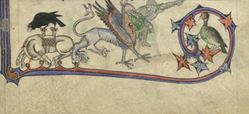 Keywords: A Soldier Fighting A Griffin In The 'Alphonso' Psalter.jpg en Heraldry on the first page of the Psalms text strongly suggests that this Psalter was commissioned by King Edward I for the marriage of his son Alphonso to Margaret daughter of Florent V Count of Holland which was to take place in 1284 Alphonso died before the wedding however and the decoration of the manuscript was left incomplete Additions were made in the early 14th century probably before 1316 In the lower border a horse lies dying presumably wounded by the griffin a fabulous monster with the head wings and claws of an eagle and the hindquarters of a lion which is being speared by the horse's rider a soldier in a full suit of chain-mail 1284 http //www bl uk/onlinegallery/onlineex/illmanus/other/011add000024686u00018000 html author PD-old-100 Uploaded with UploadWizard Soldiers |