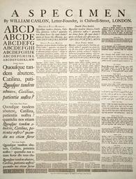 | Keywords: A Specimen by William Caslon.jpg Assessments 1 Typeset writing examples A specimen sheet of typefaces and languages by William Caslon I letter founder; from the 1728 en Cyclopaedia Schriftmusterblatt der Schriftgiesserei von William Caslon http //images library wisc edu/HistSciTech/EFacs/Cyclopaedia/Cyclopaedia02/XL/0089 jpg uploaded to the English Wikipedia by Janke as Image Caslonsample jpg probably deleted soon 16 26 23 March 2006 1728 or earlier William Caslon PD Caslon-schriftmusterblatt cleaned jpeg PD-old-100 Sample texts used Most of the texts have typographical errors preserved in their transcriptions here Square brackets contain differences between multiple occurences of the same sample text ; Latin text Ciceronis Oratio in Catilinam Prima; §§ 1 3 5 7 9 <sup> at wikisource </sup> Quousque tandem abutêre Catilina patientia nostra quamdiu nos etiam furor iste tuus eludet quem ad finem sese effrenata jactabit audacia nihilne te nocturnum præsidium palatii nihil urbis vigiliæ nihil timor populi nihil consensus bonorum omnium nihil hic munitissimus habendi se- Melium novis rebus studentem manu sua occîdit Fuit fuit ista quondam in hac repub virtus ut viri fortes acrioribus suppliciis civem perniciosum quam acerbissimum hostem coërcerent Habemus enim senatusconsultum in te Catilina vehemens grave non deest reip consilium neque autoritas hujus ordinis nos nos dico aperte consules desumus Decrevit quondam senatus At nos vigesimum jam diem patimur hebescere aciem horum autoritatis habemus enim hujusmodi senatusconsultum verumtamen inclusum in tabulis tanquam gladium in vagina reconditum quo ex senatusconsulto confestim interfectum te esse Catilina convenit Vivis vivis non ad deponendam sed ad confirmandam audaciam Cupio P C me esse clementem cupio in tantis reipub periculis non dissolutum videri sed jam meipsum inertiæ Verum ego hoc quod jampridem factum esse oportuit certa de caussa nondum adducor ut faciam tum denique interficiam te cum jam nemo tam improbus tam perditus tam tui similis inveniri poterit qui id non jure factum esse fateatur Quamdiu quisquam erit qui te defendere audeat vives vives ita ut nunc vivis multis meis firmis præsidiis obsessus ne commovere te contra rempub possis multorum te etiam oculi aures non sentientem sicut adhuc fecerunt speculabuntur atque custodient Etenim quid est Catilina quod jam amplius exspectes Novemb C Manlium audaciæ satellitem atque administrum tuæ num me fefellit Catilina non modo res tanta tam atrox tam incredibilis verum id quod multo magis est admirandum dies Dixi ego idem in senatu cædem te optimatum contulisse in ante diem v Kalend Novemb tum cum multi principes civitatis Rom non tam sui conservandi quam tuorum consiliorum reprimendorum caussa profugerunt num inficiari potes te illo ipso die meis præsidiis mea diligentia circumclusum commovere te contra rempub non potuisse; cum tu discessu ceterorum nostra tamen qui remansissemus cæde contentum te esse dicebas Quid cum te Præneste Kalend ipsis Novembris occupaturum nocturno O dii immortales ubi-nam gentium sumus quam rempub habemus in qua urbe vivimus hic hic sunt in nostro numero P C in hoc orbis terræ sanctissimo gravissimoque consilio qui de meo nostrumque omnium interitu qui de hujus urbis atque adeo orbis terrarum exitio cogitent hosce ego video consul de republica sententiam rogo quos ferro trucidari oportebat eos nondum voce vulnero Fuisti igitur apud Leccam ea nocte Catilina distribuisti partes Italiæ statuisti quo quemque proficisci placeret delegisti quos Romæ relinqueres quos tecum educeres descripsisti urbis partes ad incendia confirmasti te ipsum jam esse exiturum dixisti paululum tibi esse etiam tum moræ quod ego viverem Reperti sunt duo equites Romani qui te ista cura liberarent sese illa ipsa nocte paulo ante lucem me in meo lectulo interfecturos pollicerentur Hæc ego omnia vix dum etiam coetu vestro dimisso comperi domum meam majoribus præsidiis munivi atque firmavi exclusi eos quos tu mane ad me salutatum miseras cum illi ipsi venissent ; Saxon text Old English version of Venerabilis Baedae Historia ecclesiastica gentis Anglorum; book I §7 <sup> reference </sup> Ða he da mid grimmum fwinglum tintregum wæced wæs he ealle þa witu ðe him man dyde geþyldelice gefeonde sor dritne abær ar ; English text not identified And be it further enacted by the Authority aforesaid That all and every of the said Exchequer Bills to be made forth by virtue of this Act or so many of them as shall from time to time remain undischarged and uncancelled until the discharging and cancelling the same pursuant to this Act ; Gothic text First verse of the Lord's Prayer <sup> at wikisource </sup> 𐌰𐍄𐍄𐌰 𐌿𐌽𐍃𐌰𐍂 𐌸𐌿 𐌹𐌽 𐌷𐌹𐌼𐌹𐌽𐌰𐌼 𐍅𐌴𐌹𐌷𐌽𐌰𐌹 𐌽𐌰𐌼𐍉 𐌸𐌴𐌹𐌽 𐌵𐌹𐌼𐌰𐌹 𐌸𐌹𐌿𐌳𐌹𐌽𐌰𐍃𐍃𐌿𐍃 𐌸𐌴𐌹𐌽𐍃 𐍅𐌰𐌹𐍂𐌸𐌰𐌹 𐍅𐌹𐌰𐌾𐌰 𐌸𐌴𐌹𐌽𐍃 𐍃𐍅𐌴 𐌹𐌽 𐌷𐌹𐌼𐌹𐌽𐌰 ; Coptic text Genesis 1 1 3 <sup> http //www moheb de/Bible_books html at external site </sup> unified Greek and Coptic characters Ϧεη ουαρχη ὰφϯ θαμὸ ν τφε νεμ καϩι ικαϩι δε νε ουαθναυ ὲροϥ ε ουοϩ ν ατσοβϯ ουχακι ναϥχη εϫεν φνουν ουοϩ ου ͞ν͞α ν τεφϯ ναϥνηου ϩιϫεν νι ωου ο- disunified Coptic characters Ϧ ϯ ϩ ϩ ϥ ϩ ϯ ϥ ϫ ϩ ͞ ͞ ϯ ϥ ϩ ϫ - ; Armenian text Mosis Chorenensis Historia Armeniaca; book I §9 <sup> http //titus uni-frankfurt de/texte/etcs/arm/mokhor/mokho010 htm at external site </sup> Ա շակ Թագաւո ե կ ի և ծովու ո ոյ անձն և պատկե ո պէս և է իսկ մե Աստուծոց իսկ բախտ և պատահուﬓ ՚ի վե քան զա̅ մ թագաւո աց և մտաց լայնութ̅ ի ո չափ ե կնի ; Syriac text Peshitta; John 3 16 <sup> http //w