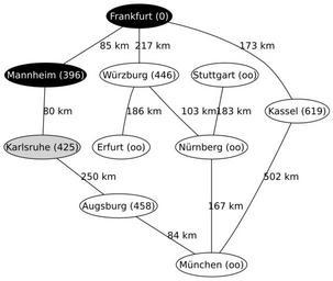 | Keywords: A-Star3.svg Zweiter Schritt Mannheim wurde erkundet als nächstes wird Karlsruhe untersucht Third step of a run of the A search Algorithm on a map of Germany Created by Regnaron with graphviz A search algorithm 2005-11-06 own assumed Regnaron~commonswiki |