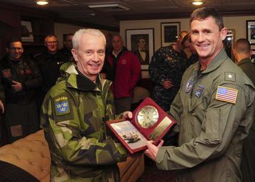 | Keywords: A token of appreciation 150322-N-ZZ999-017.jpg en 150322-N-ZZ999-017 ATLANTIC OCEAN Commander Carrier Strike Group 12 Rear Adm Andrew Lewis right presents a token of appreciation to the Swedish Supreme Commander Gen Sverker Göranson aboard the Nimitz-class aircraft carrier USS Theodore Roosevelt March 22 2015 Theodore Roosevelt homeported in Norfolk is conducting naval operations in the U S 6th Fleet area of operations in support of U S national security interests in Europe 2015-03-22 March 22 2015 https //www dvidshub net/image/1829198 150322-N-ZZ999-017 2015-03-22 19 39 USS THEODORE ROOSEVELT ATLANTIC OCEAN AT SEA PD-USGov-Military-Navy USS Theodore Roosevelt CVN-71 Images from DoD uploaded by Fæ Sverker Göranson |