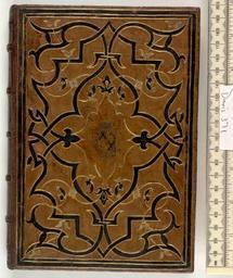 | Keywords: A Tragoedie or Dialoge of the uniuste usurped Primacie of the Bishop of Rome ... translated out of Latine ... by ... John Ponet. - Upper cover (Davis371).jpg Style Armorial Interlacing ribbon/strapwork Arabesque; Caption Upper cover; Colour Brown; Edge Gilt exhibition history Decorative Technique Tooled in gold Painted Tooled in silver; Cover Material Calf Bound in Paris by Wotton Binder C for Thomas Wotton c 1549-1551 Macchi states; c 1550 Paris strapwork Wotton binding A similar example is reproduced in Historic artistic bookbindings from the Bibliotheca Bibliographica Breslaueriana p 14-15 n 1 object history Text 1549; London; Wotton Thomas object type Cc-zero place of creation Binding France place of discovery See M M Foot The Henry Davis Gift Vol III London 2010 British Library image http //www bl uk/catalogues/bookbindings/LargeImage aspx RecordId 020-000003960 ImageId ImageId 41585 Copyright BL A Tragoedie or Dialoge of the uniuste usurped Primacie of the Bishop of Rome translated out of Latine by John Ponet Uploaded with GWToolset A Tragoedie or Dialoge of the uniuste usurped Primacie of the Bishop of Rome translated out of Latine by John Ponet - Upper cover Davis371 http //www webarchive org uk/bldatasets/bindings/6100_4 jpg Bookbinding 16th-century bookbinding British Library Bookbindings |