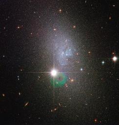 | Keywords: ddo 82 ddo82 texture outdoor Relatively few galaxies possess the sweeping, luminous spiral arms or brightly glowing centre of our home galaxy the Milky Way. In fact, most of the Universe's galaxies look like small, amorphous clouds of vapour. One of these galaxies is DDO 82, captured here in an image from the NASA/ESA Hubble Space Telescope. Though tiny compared to the Milky Way, such dwarf galaxies still contain between a few million and a few billion stars. DDO 82, also known by the designation UGC 5692, is not without a hint of structure, however. Astronomers classify it as an Sm galaxy, or Magellanic spiral galaxy, named after the Large Magellanic Cloud, a dwarf galaxy that orbits the Milky Way. That galaxy, like DDO 82, is said to have one spiral arm. In the case of DDO 82, gravitational interactions over its history seem to have discombobulated it so that this structure is not as evident as in the Large Magellanic Cloud. Accordingly, astronomers also refer to DDO 82 and others of a similar unshapely nature as dwarf irregular galaxies. DDO 82 can be found in the constellation of Ursa Major (the Great Bear) approximately 13 million light-years away. The object is considered part of the M81 Group of around three dozen galaxies. DDO 82 gets its name from its entry number in the David Dunlap Observatory Catalogue. Canadian astronomer Sidney van den Bergh originally compiled this list of dwarf galaxies in 1959. The image is made up of exposures taken in visible and infrared light by Hubble’s Advanced Camera for Surveys. The field of view is approximately 3.3 by 3.3 arcminutes. Relatively few galaxies possess the sweeping, luminous spiral arms or brightly glowing centre of our home galaxy the Milky Way. In fact, most of the Universe's galaxies look like small, amorphous clouds of vapour. One of these galaxies is DDO 82, captured here in an image from the NASA/ESA Hubble Space Telescope. Though tiny compared to the Milky Way, such dwarf galaxies still contain between a few million and a few billion stars. DDO 82, also known by the designation UGC 5692, is not without a hint of structure, however. Astronomers classify it as an Sm galaxy, or Magellanic spiral galaxy, named after the Large Magellanic Cloud, a dwarf galaxy that orbits the Milky Way. That galaxy, like DDO 82, is said to have one spiral arm. In the case of DDO 82, gravitational interactions over its history seem to have discombobulated it so that this structure is not as evident as in the Large Magellanic Cloud. Accordingly, astronomers also refer to DDO 82 and others of a similar unshapely nature as dwarf irregular galaxies. DDO 82 can be found in the constellation of Ursa Major (the Great Bear) approximately 13 million light-years away. The object is considered part of the M81 Group of around three dozen galaxies. DDO 82 gets its name from its entry number in the David Dunlap Observatory Catalogue. Canadian astronomer Sidney van den Bergh originally compiled this list of dwarf galaxies in 1959. The image is made up of exposures taken in visible and infrared light by Hubble’s Advanced Camera for Surveys. The field of view is approximately 3.3 by 3.3 arcminutes. |