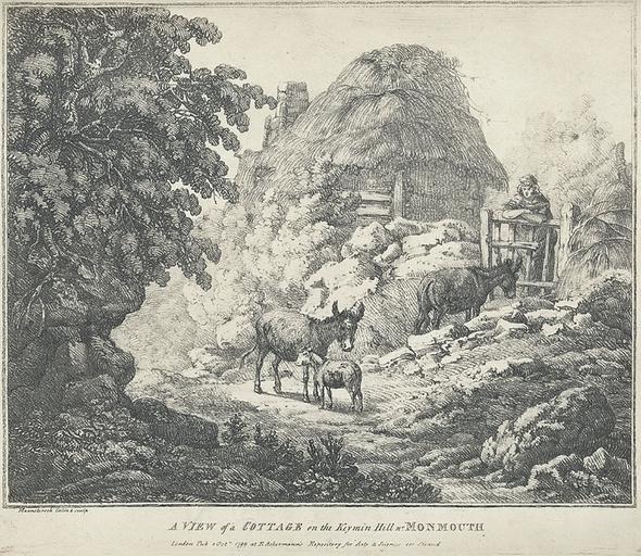 | Keywords: A View of a Cottage on the Keymin Hill Nr. Monmouth.jpeg Abstract Thatch roof cottage woman leaning on a gate looking at ponies/donkey Size mm 317 340 exhibition history Institution National Library of Wales Technique print etching bw object history object type PD-old-100-1923 place of creation place of discovery 1129259 A View of a Cottage on the Keymin Hill Nr Monmouth Q21542493 Uploaded with GWToolset A View of a Cottage on the Keymin Hill Nr Monmouth http //dams llgc org uk/behaviour/llgc-id 1129259/fedora-bdef image/reference Images uploaded as part of NLW - WMUK collaboration Welsh Landscape Collection Monmouth Wales 1790s Dwelling houses Equus asinus |