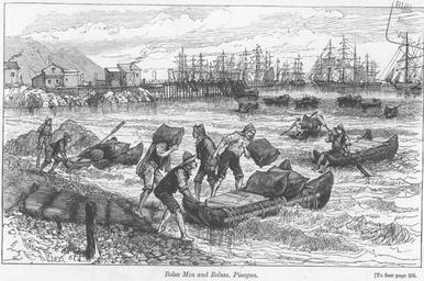 | Keywords: A Visit to Chile 1890 37.png en A Visit to Chile and the Nitrate Fields of Tarapaca 1890 page 235 From the Station I walked to the beach close to the railway where the surf was breaking on the rocks and the bolsa men were loading the lighters with nitrate an operation exceedingly well-managed and very interesting to look at The lighters cannot approach the shore owing t o the surf and they can only lie at the pier when it is very smooth indeed and that very seldom happens on this Pacific coast So the nitrate bags are carried from the wharf by the iioba men off to the lighters which lie outside the line of breakers Practice makes perfect The bolsa is simply a couple of large bladders which are made from the skins of the sea-lions which are dressed and trimmed by the Chilians; along the coast the extremities being closed and sewn up in the form of a 1890 A Visit to Chile and the Nitrate Fields of Tarapaca etc by William Howard Russell Ll D With illustrations of Mr Melton Prior Melton Prior other versions Saltpeter Works of Chile Tarapaca Valparaiso Railroad of Chile PD-old-70-1923 A Visit to Chile and the Nitrate Fields of Tarapaca |