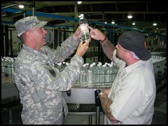 | Keywords: A weapon of a different kind DVIDS101175.jpg en Col Kevin O'Connell a Clinton Md native and commander of the 1st Sustainment Brigade inspects a bottle of water at the Oasis Bottled Water Plant The Oasis Bottled Water Plant on Camp Liberty is the largest of six such facilities in theater ”at full capacity the plant produces over 450 000 one liter bottles per day The 553rd Combat Sustainment Support Battalion 1st SB is responsible for maintaining overall accountability of that stock and ensuring it is delivered to Soldiers on the battlefield 2008-07-08 https //www dvidshub net/image/101175 101175 2008-07-08 05 13 BAGHDAD IQ PD-USGov Camp Liberty Images from DoD uploaded by Fæ |