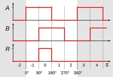 | Keywords: AB Signal and Ref.svg 2 electrically by 90° phase-shifted square-wave pulses A B as output of en Rotary encoder and a Reference pulse R Below is the count at 4-fold evaluation 2 um 90° elektrisch phasenversetzte Rechteckimpulse A B wie sie de Inkrementalgeber ausgeben und ein Refernzimpuls R Darunter steht der Zählerstand bei 4-fach Auswertung own MatthiasDD 2012-04-14 Square waves Cc-zero | ||||
