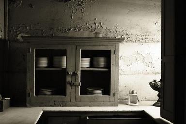 Keywords: abandoned building old building kitchen plates cupboard black white