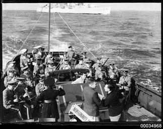 | Keywords: hood collection hoodcollection samuel j hood collection samueljhoodcollection hood royal australian navy royalaustraliannavy navy naval vessel navalvessel sydney hmas australia hmasaustralia flagship hmas canberra hmascanberra abc australian broadcasting commission australianbroadcastingcommission military band militaryband abc military band abcmilitaryband national military band nationalmilitaryband sydney heads sydneyheads sydney harbour sydneyharbour stanley ash stanleyash stan ash stanash blackandwhite monochrome photo border black and white This photograph probably depicts the Australian Broadcasting Commission 22-piece Military Band (also known as the National Military Band) with a conductor, possibly Stephen Yorke, performing on board a small vessel with an Australian Broadcasting Commission commentator. A Royal Australian Navy heavy cruiser - either HMAS AUSTRALIA or HMAS CANBERRA - can be seen in the distance. This photo is part of the Australian National Maritime Museum’s Samuel J. Hood Studio collection. Sam Hood (1872-1953) was a Sydney photographer with a passion for ships. His 60-year career spanned the romantic age of sail and two world wars. The photos in the collection were taken mainly in Sydney and Newcastle during the first half of the 20th century. The ANMM undertakes research and accepts public comments that enhance the information we hold about images in our collection. This record has been updated accordingly. Photographer: Samuel J. Hood Studio Collection Object no. 00034968 This photograph probably depicts the Australian Broadcasting Commission 22-piece Military Band (also known as the National Military Band) with a conductor, possibly Stephen Yorke, performing on board a small vessel with an Australian Broadcasting Commission commentator. A Royal Australian Navy heavy cruiser - either HMAS AUSTRALIA or HMAS CANBERRA - can be seen in the distance. This photo is part of the Australian National Maritime Museum’s Samuel J. Hood Studio collection. Sam Hood (1872-1953) was a Sydney photographer with a passion for ships. His 60-year career spanned the romantic age of sail and two world wars. The photos in the collection were taken mainly in Sydney and Newcastle during the first half of the 20th century. The ANMM undertakes research and accepts public comments that enhance the information we hold about images in our collection. This record has been updated accordingly. Photographer: Samuel J. Hood Studio Collection Object no. 00034968 |