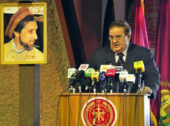 | Keywords: Abdul Rahim Wardak in Kabul April 2010.jpg Afghanistan's Minister of Defense w Abdul Rahim Wardak speaks at the two day quarterly Corps Commander Conference and Security Shura held on April 13th and 14th 2010 at the ANAAC base in Kabul Afghanistan The Purpose of the conference was to evaluate the security stability and development of Afghanistan The picture on the wall is of Ahmad Shah Massoud US Navy photo by Mass Communication Specialist 2nd Class David Quillen 100415-N-6031Q-002 http //www flickr com/photos/29456680 N06/4522481559/ 100413-N-6031Q-002A JPG 2010-04-13 09 55 Mass Communication Specialist 2nd Class David Quillen U S Navy PD-USGov-Military-Navy File Upload Bot Magnus Manske April 16 2010 de minimis the portrait of Ahmad Shah Massoud on the left Abdul Rahim Wardak Ahmad Shah Massoud |