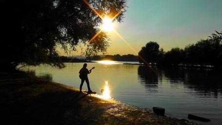 Keywords: abendstimmung guitar player rhine river waters landscape mood nature romance mirroring evening sunset silhouette lights atmosphere reflection light human romantic sunbeam light effects rays luck