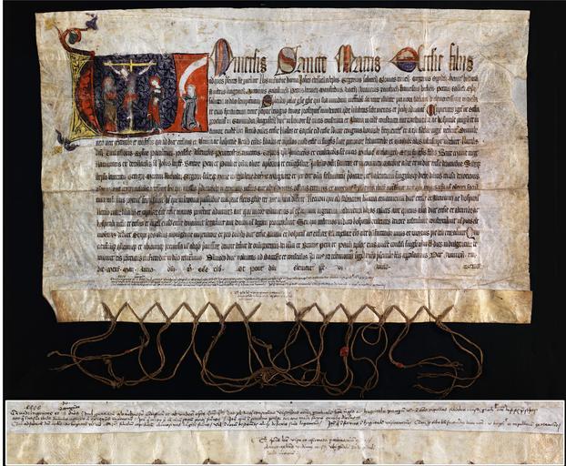 | Keywords: Ablass für die Pfarrkirche zum hl Kreuz Schwäbisch-Gmünd.jpg Ablass von 12 Erzbischöfen und Bischöfen für die Pfarrkirche zum hl Kreuz das Spital und alle Filialkirchen und -kapellen in Schwäbisch-Gmünd Avignon 1345 Mai 13 XIII die mensis maii anno domini MCCCXLV et pontificatus domini Clementis pape VI anno tercio http //www landesarchiv-bw de/plink/ f 1-324608 1345 author PD-old-100 History of Schwäbisch Gmünd Illuminated archival materials Indulgences 1345 documents | ||||