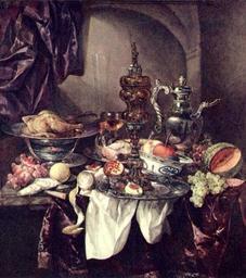 | Keywords: Abraham Hendriksz. van Beyeren 002.jpg Artwork title Prunkstilleben Still life with fruit roast silver- and glassware porcelain and columbine cup on a dark tablecloth with white serviette Pronkstilleven met fruit gebraad zilver- en glaswerk porselein en akeleibeker op donker kleed met wit servet Q20963006 Oil on canvas cm 110 98 Institution Staatliche Kunsthalle Karlsruhe Object history by 1845 George Francis Wyndham 1786-1845 4th Earl of Egremont England acquisition William Wyndham Orchard Wyndham 1953 4 24 anonymous sale Christie's London 64 ProvenanceEvent 1955 acquisition N N art dealer Paris ProvenanceEvent 1955/1956 acquisition N N by 1956 loan Rijksmuseum Amsterdam inv SK-A-505A3 N N by 1970 Herbert Girardet 1910-1972 Kettwig Germany Karlsruhe inv 2737 The Yorck Project 10 000 Meisterwerke der Malerei DVD-ROM 2002 ISBN 3936122202 Distributed by DIRECTMEDIA Publishing GmbH 2737 between 1650 1670 Creator Abraham van Beijeren http //mail wikipedia org/pipermail/wikide-l/2005-April/012195 html Other versions 183 Pronkstilleven met fruit gebraad zilver- en glaswerk porselein en akeleibeker op donker kleed met wit servet Other date decade 1650-1660 1650-1669 Exhibition history Verzameling Girardet 5 PD-old-100 PD-Art-YorckProject Baroque still life paintings of food Paintings in Staatliche Kunsthalle Karlsruhe Beijeren 17th-century still life paintings in Germany Baroque paintings in Karlsruhe 1650s still life paintings 1660s still life paintings 1650s paintings in Baden-Württemberg 1660s paintings in Baden-Württemberg Still life paintings of tableware Oil still life paintings Still-life paintings of glassware Fruit bowls in art Still life paintings by Abraham van Beijeren 1650 Paintings of silverware Paintings of melons Porcelain tableware in art Tablecloths in purple Tablecloths in art |
