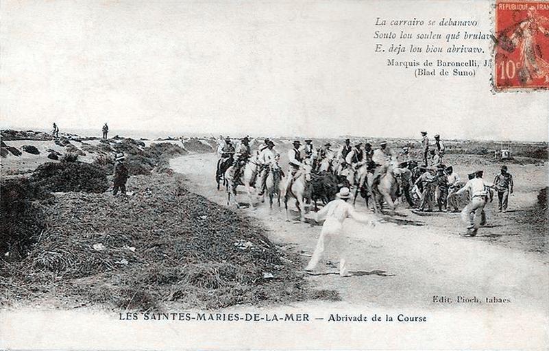 | Keywords: Abrivade.jpg fr Abrivade arrivée des taureaux encadrés par des gardians à cheval en Camargue France own Christian Lassure Early 20th century / Début du XXe siècle Cc-zero Camargue cattle Postcards of Saintes-Maries-de-la-Mer Regional clothing in Camargue Abrivado Horse riding in France Camargue horse |