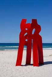 Keywords: abstract sculpture art red standing contemporary modern beach sand sea blue sky australia exhibition