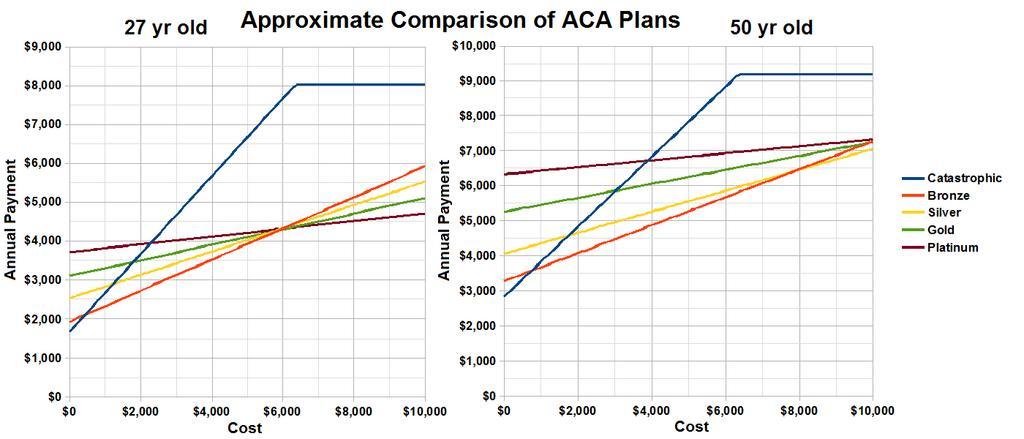 Keywords: ACA Cost Comparison Estimate.png en Affordable Care Act cost comparison estimate for the five different plans This chart may not be used to estimate anyone's actual costs and is just a demonstration of the difference between paying 100 40 30 20 and 10 of the cost up to 6350 for the Catastrophic Bronze Silver Gold and Platinum plans The actual plans that are available contain a wide variety of deductibles and co-pays which dramatically change the actual cost of health care The bottom cost axis is the cost of health care if all costs were paid out of pocket For example a 27 year old who incurs 2000 of actual health care costs would in these examples pay from 2700 to 4000 depending on the plan chosen and a 50 year old with 2000 in actual health care costs would pay from 4000 to 6500 10 000 of health care would cost a 27 year old from 4600 to 8000 depending on plan and for a 50 year old would cost from 7200 to 9000 Out of pocket costs are capped at 6350 for all plans which does not include premiums Some plans have lower caps 2013-10-24 own Delphi234 cc-zero Uploaded with UploadWizard Healthcare in the United States |