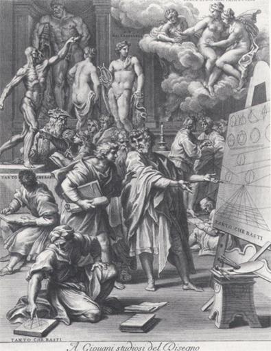 | Keywords: Academic students.jpg Academy of design Au milieu des statues Léonard au fond à gauche commente l'anatomie d'un écorché Dans les airs sont représentées Vénus et des déesses en haut à droite au-dessus desquelles on lit SENZA DI NOI OGNI FATICA E VANA ; au-dessus de la statue d'Appolon NON MAI A BASTANZA ; et par trois fois sur le socle d'une statue sur le chevalet sous une pierre gravée TANTO CHE BASTI Dans la marge A Giovani studiosi del Disegno// La Scuola del Disegno che s'espone delineata con la presenti Figure dal Sig r Cavalier Carlo Maratti può molto contribuire al' disinganno di coloro che credono di potere con la cognizione e studio di mol// te Arti divenir perfetti nell'Arte del dipingere senza precurare in primo luogo d'esser perfettissimi nel Disegno e senza il dono naturale et un particolare istinto di saper con grazia e facilità animare e disporre vagamente le// parti di quell'Opera che prenderanno a delineare e và figurando questo suo nobil pensiero con il mezzo dell'azzioni che qui si additano Vedonsi alcuni studiosi delle mathematiche in // quella parte che spetta alla Geometria et Ottica che conferiscono alla Prospettiva; dall'altro lato altri applicati all'osservazione d'un corpo anatomico dà cui si apprende la giusta proporzione // delle membra e sito de' muscoli e nervi che compongono una figura dimostrato eruditamente da Leonardo da Vinci espresso con la propria effigie con il motto Tanto che basti per dimostrare che di tali professio ni basta che quello che attendera al Disegno sia mediocrem te erudito per ridurre ad un' perfetto fine qualunque Idea Mà per coloro che si esprimono attenti allo studio delle statue antiche non serve una leggiera applicazione al//le med e essendo lor duopo di farvi sopra una lunga et esatta riflessione e studio per apprenderne le belle forme; e si pone l'esemplare delle statue antiche come le più perfette nelle quali quei grandi Huomini espres//sero i Corpe nel più perfetto grado che possano dalla natura istessa crearsi e perciò vi si pone il motto Non mai a bastanza Tutto però riuscirebbe vano di conseguire senza l'assitenza delle Grazie che intende come accennammo per quel natural gusto di disporre et atteggiare con grazia e delicatezza le positure et i movimenti delle Figure dalle quali poi risulta quella vaghezza e leggiadria che destano meravi//glia e piacere in chiunque le mira ponendosi queste a tal oggetto inalto e fù le nuvole per significare che questo dono non viene che dal Cielo con il motto Senza di noi ogni fatica e vana Vivete felici // Eques Carolus Maratti inven et delin Cum privil Summi Pont et Regis Christ mi / N Dorigny Sculp Un second état daté de 1728 porte l'excudit de Giovanni Giacomo Frey http //www mimsstudios com/arthistory htm circa 1704 1709 Carlo Maratti PD-old Allegories of arts Carlo Maratti |