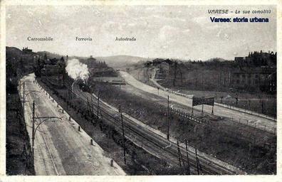 | Keywords: A sinistra (ancora con fondo sterrato) la carrozzabile: l'odierna via Gasparotto con la linea tramviaria per Azzate (aperta nel 1911), al centro i binari delle Ferrovie dello Stato (in funzione dal 1865) e a destra l'autostrada per Milano (aperta nel 1924). varese |