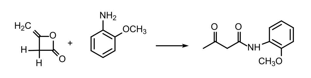 Keywords: Acetoacetanilid aus Diketen.svg en Synthesis of 2-Methoxyphenylacetoacetanilide de Synthese von 2-Methoxyphenylacetoacetanilid own ChemDoc 2010 2012-03-01 Cc-zero Organic reactions Diketene