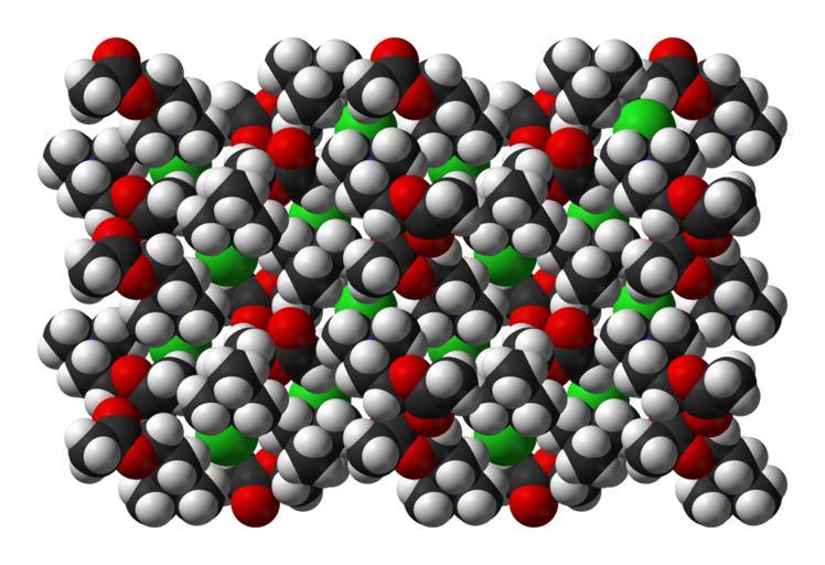 | Keywords: Acetylcholine-chloride-xtal-1996-3D-balls.png Space-filling model of part of the crystal structure of acetylcholine chloride C<sub>7</sub>H<sub>16</sub>NO<sub>2</sub>Cl Colour code Carbon C black Hydrogen H white Nitrogen N blue Oxygen O red Chlorine Cl green Crystal structure by X-ray diffraction from http //dx doi org/10 1107/S0108768195007567 Acta Cryst 1996 B52 184-193 Model constructed in http //www crystalmaker com/ CrystalMaker 8 1 Image generated in http //accelrys com/products/discovery-studio/visualization/discovery-studio-visualizer html Accelrys DS Visualizer Own 2009-07-19 Ben Mills Benjah-bmm27 Images by Ben Mills Space-filling models Acetylcholine chloride Crystal structures of organic compounds |
