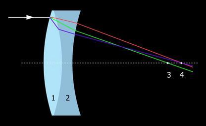 | Keywords: Achromat 2.svg Achromat; 1 - crown glass 2 - flint glass 3 - focal point for green light; 4 - common focal point for red and blue light Note refraction angles are axaggerated and may not reflect true run of light beam s English Polish Chromatic aberration diagrams Flint glass |