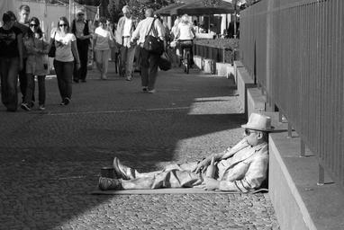 Keywords: action artists street artists pantomime man concerns lying actor representation street scene human people sidewalk pavement drinkers city city scene berlin passers by germany fig black and white