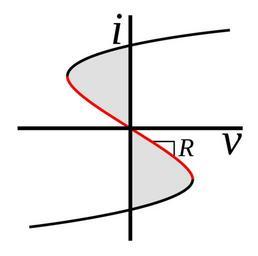 | Keywords: Active negative resistance - current controlled.svg Current-voltage IV diagram of a linear negative resistance produced at the port of an amplifier with positive feedback The curve has a straight line segment through the origin with negative slope -R so applying a voltage v to the amplifier causes a proportional current i to flow out of the positive terminal the opposite of an ordinary positive resistance The device has both negative differential resistance grey region and negative static resistance <font color red >red</font> region <br /> <math>R v \over i \Delta v \over \Delta i < 0 \ </math> Applying a large enough current of either polarity to it moves the amplifier into nonlinear regions of the curve saturating the amplifier so the resistance becomes positive black portion of curve This type of negative resistance is found in feedback oscillators negative impedance converters and active filters own Chetvorno 2013-07-22 Negative resistance Device current-voltage characteristics Cc-zero |