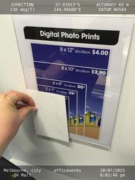 Keywords: WOOLWORTHS LIMITED 1 WOOLWORTHS WAY BELLA VISTA NSW 2153 AUSTRALIA Attention: Mr. Mark Ward CEO of Officeworks "ACTUAL SIZED" DIGITAL PHOTO PRINTS SAMPLE NEEDED TO AVOID MISLEADING CUSTOMERS Dear Mr. Ward, I wish you well. I am a frequent shopper at Officeworks. Imagine that you are a customer looking at the photo enclosed. The information on the sign does not relate to the actual photo size. Do you not think this is misleading? I know it is difficult to change the sign (photo enclosed) due to politically correct reasons. I hope that you could store this feedback in your company’s knowledge base until such time is appropriate to reference to this feedback to change the misleading signs for the good of Officeworks and customers. retail technology transportation signs foodanddrinks