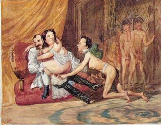 | Keywords: Acuarela 97.JPG es Acuarela 97 Isabel II con su intendente Carlos Marfori Fco de AsÃs A la derecha espera un batallón de guardia Leyenda de la acuarela Isabel ”Espérate a que acabe mi intendente Paquita ”¡Aguardemos la vez como en la fuente century 19 Los Borbones en pelota AtribuÃdo a Valeriano DomÃnguez Bécquer Gustavo Adolfo Bécquer Existe desacuerdo por parte del académico experto en Bécquer Joan Estruch Tobella declaraciones documental Bécquer Desconocido min 38 36 aproximadamente http //vimeo com/16724972 PD-old Los Borbones en pelota Threesome with one woman and two men in art Uploaded with UploadWizard Isabella II of Spain caricatures Carlos Marfori |