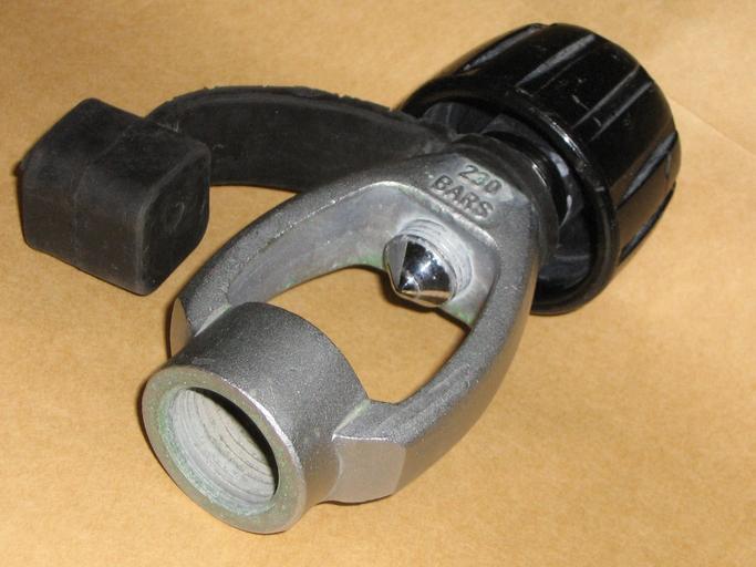 | Keywords: Adaptor (yoke to DIN).jpg An adaptor which allows a DIN-standard scuba regulator to connect onto a diving cylinder that has a yoke A-clamp pillar valve self-made; photograph of my own diving equipment taken with a Canon A410 2008-01-06 RexxS DIN standards Clamps with screws Underwater diving pressure gas equipment |