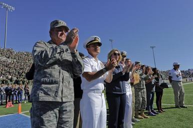 | Keywords: Adm. Harry Harris attends closing ceremony of 2014 Warrior Games 141004-N-LD296-002.jpg en Adm Harry Harris Jr commander of U S Pacific Fleet Gen Mark Welsh chief of staff of the U S Air Force and Secretary of the Air Force Deborah Lee James clap during halftime of the Navy vs Air Force football game Senior military leaders from the Army Navy Marine Corps and Air Force celebrated as participants from the 2014 Warrior Games were honored during the game U S Navy photo by Senior Chief Mass Communication Specialist Michael Lewis/Released 2014-10-04 Senior Chief Petty Officer Michael Lewis https //www dvidshub net/image/1598023 141004-N-LD296-002 2014-10-04 20 37 COLORADO SPRINGS CO US PD-USGov-Military-Navy 2014 Warrior Games Images from DoD uploaded by Fæ |