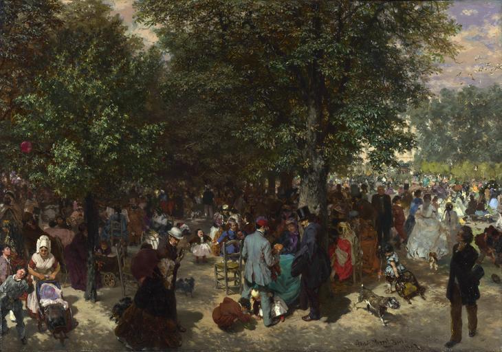 | Keywords: Adolph Menzel, Afternoon in the Tuileries Gardens, 1867.jpg Artwork en Adolph Menzel was the leading German artist of the second half of the 19th century This painting of the Tuileries Gardens in Paris was executed by him in 1867 following a visit to the city to see that year's Universal Exposition It was almost certainly inspired by another of the National Gallery's paintings Manet's 'Music in the Tuileries Gardens' painted just five years earlier Both paintings share a fascination with the bustling social scene of the day in the Tuileries Gardens adjacent to the Louvre in the heart of Paris but are executed in strikingly different styles Menzel's approach is both more realistic and filled with detail He invites the viewer to move from incident to closely observed incident across the canvas Menzel made several sketches in the Tuileries Gardens which he took back to Berlin with him although none of these actually anticipate the composition of the finished painting Although painted in a more traditional academic style Menzel does pay a kind of homage to Manet by quoting from his painting The standing man in top hat in the foreground just right of centre closely resembles a similar figure in Manet's painting When he first exhibited the work Menzel made the point of indicating that it was executed from memory 1867 Oil on canvas 49 x 70 cm Institution National Gallery London object history provenanceEvent purchase 1935 private collection Staatliche Kunstsammlungen Dresden Galerie Neue Meister Nr 2442 A provenanceEvent restitution 2005 London exhibition history credit line Bought with the assistance of the American Friends of the National Gallery London the George Beaumont Group and a number of gifts in wills including a legacy from Mrs Martha Doris Bailey in memory of her husband Mr Richard Hillman Bailey 2006 http //www nationalgallery org uk/paintings/adolph-menzel-afternoon-in-the-tuileries-gardens National Gallery London Adolf Menzel Berl 1867 ~ lower right signature and date accession number NG6604 PD-100 Afternoon in the Tuileries Gardens by Adolph von Menzel German paintings in the National Gallery London Paintings formerly in the Galerie Neue Meister Dresden |