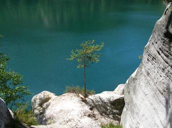 Keywords: adršpach bohemia pine water lake needles tree sun surface