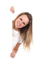 Keywords: advert advertising banner blank board card business empty female girl isolated people person sign smile space white woman young cute happy