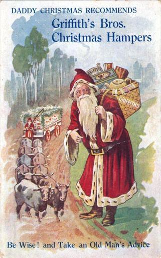 | Keywords: christmas australia vintage postcard 1908 brisbane griffiths bros griffithsbros tea santa bullock team bullockteam hamper advertising drawing Christmas advertising postcard for Griffith's Brothers in Queen Street, Brisbane - 1908. They sold tea pots, tea caddies, confectionary and chocolates etc. Here is a newspaper advertisement for their Christmas selection in 1922: trove.nla.gov.au/ndp/del/article/177124323?searchTerm=gri... Christmas advertising postcard for Griffith's Brothers in Queen Street, Brisbane - 1908. They sold tea pots, tea caddies, confectionary and chocolates etc. Here is a newspaper advertisement for their Christmas selection in 1922: trove.nla.gov.au/ndp/del/article/177124323?searchTerm=gri... |