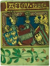 | Keywords: AEIOU Buchmalerei in der Handregistratur König Friedrichs IV 1446.jpg AEIOU Buchmalerei in der Handregistratur König Friedrichs IV des späteren Kaisers Friedrich III 1446 http //www aeiou at/aeiou encyclop data image a/a128205a jpg 1446 Creator Unknown PD-old-100 Frederick III Holy Roman Emperor A E I O U 1446 Altösterreich coat of arms Coats of arms of the Dukes of Austria State coats of arms of Upper Austria 15th-century illuminated manuscripts Pfauenstoß | ||||