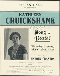 | Keywords: text sign A flier advertising a recital by Kathleen Cruickshank, whose photographic portrait appears at the left. The verso shows the programme which includes songs by Reimann, Schumann, Schubert, Wolf, Keel, Parry, Stanford, Bantock, Bliss. Dated according to perpetual calendar. Kathleen Cruickshank was in England from about 1921 to 1927. Quantity: 1 colour photo-mechanical print(s) on flier. Physical Description: Offset print on flier, 252 x 198 mm. Baines & Scarsbrook Ltd. Aeolian Hall (New Bond Street, W). Kathleen Cruickshank [of New Zealand]. Song recital, Thursday evening, May 27th, at 8.30. At the piano, Harold Craxton. Baines and Scarsbrook Ltd., printers, Swiss Cottage, N.W.6. [1926]. [Theatre programmes for concerts, recitals and music events in Great Britain some featuring New Zealand performers and producers. 1900-1959]. Ref: Eph-B-MUSIC-GB-1926-01. Alexander Turnbull Library, Wellington, New Zealand. natlib.govt.nz/records/22759812 A flier advertising a recital by Kathleen Cruickshank, whose photographic portrait appears at the left. The verso shows the programme which includes songs by Reimann, Schumann, Schubert, Wolf, Keel, Parry, Stanford, Bantock, Bliss. Dated according to perpetual calendar. Kathleen Cruickshank was in England from about 1921 to 1927. Quantity: 1 colour photo-mechanical print(s) on flier. Physical Description: Offset print on flier, 252 x 198 mm. Baines & Scarsbrook Ltd. Aeolian Hall (New Bond Street, W). Kathleen Cruickshank [of New Zealand]. Song recital, Thursday evening, May 27th, at 8.30. At the piano, Harold Craxton. Baines and Scarsbrook Ltd., printers, Swiss Cottage, N.W.6. [1926]. [Theatre programmes for concerts, recitals and music events in Great Britain some featuring New Zealand performers and producers. 1900-1959]. Ref: Eph-B-MUSIC-GB-1926-01. Alexander Turnbull Library, Wellington, New Zealand. natlib.govt.nz/records/22759812 |