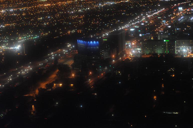 | Keywords: freeway highway motorway night aerial parking hotel inn Aerial photo of cars on I-405. The building on right with the green lights is a Holiday Inn, and the building with the blue lights reading "UNITED" is a hexagonal office building next to a LAX airport parking deck. Near Los Angeles International Airport, taken at night from a passenger plane.  CC0 waiver: To the extent possible under law, I waive all copyright and related or neighboring rights to this work. Aerial photo of cars on I-405. The building on right with the green lights is a Holiday Inn, and the building with the blue lights reading "UNITED" is a hexagonal office building next to a LAX airport parking deck. Near Los Angeles International Airport, taken at night from a passenger plane.  CC0 waiver: To the extent possible under law, I waive all copyright and related or neighboring rights to this work.  |
