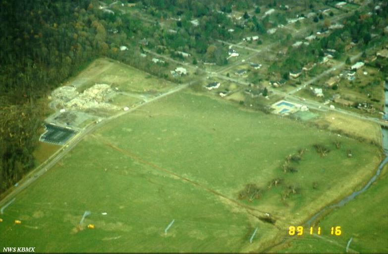 | Keywords: Aerial view 5 after the 1989 Huntsville Tornado.jpg en Damage from the November 15 1989 tornado to strike Huntsville Alabama This aerial photograph shows the demolished Jones Valley Elementary School top left looking northwest A section of Jones Farm is enclosed on the west by downed high voltage lines which crossed the hill alongside Carl T Jones Dr Garth Rd on the north Toney Dr on the east and Aldridge Creek on the south Photographed by NWS Birmingham during their storm survey 1989-11-16 http //www srh noaa gov/images/bmx/significant_events/1989/11_15/graphics/ C S;O D National Weather Service Birmingham Alabama office other versions PD-USGov 1989 Huntsville Tornado Aerial photographs of Alabama |