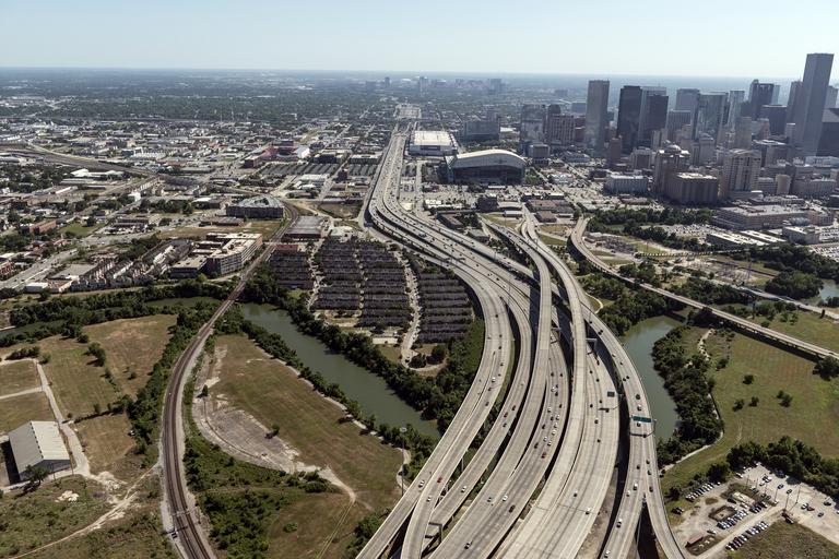 Keywords: aerial view houston highways urban roads traffic city streets travel transportation motion downtown skyline car concrete cityscape business commerce vehicles texas usa