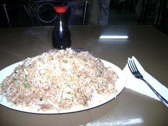 | Keywords: Aeropuerto-Chifa.JPG Un plato de 'Aeropuerto' servido en un chifa de la ciudad de Huaraz Región Ancash Perú El aeropuerto consiste en la mezcla de dos platos tradicionales del chifa comida chino-peruana que son el 'arroz chaufa' y el 'tallarín saltado' Obsérvese que estas dos preparaciones se mezclan completamente cuando son servidas en forma adyacente se le conoce como 'combinado' Junto al plato puede apreciarse una botellita de 'sillao' o salsa de soya acompañamiento tradicional de los platos del chifa peruano Own 2007-08-25 Dtarazona Arroz chaufa |