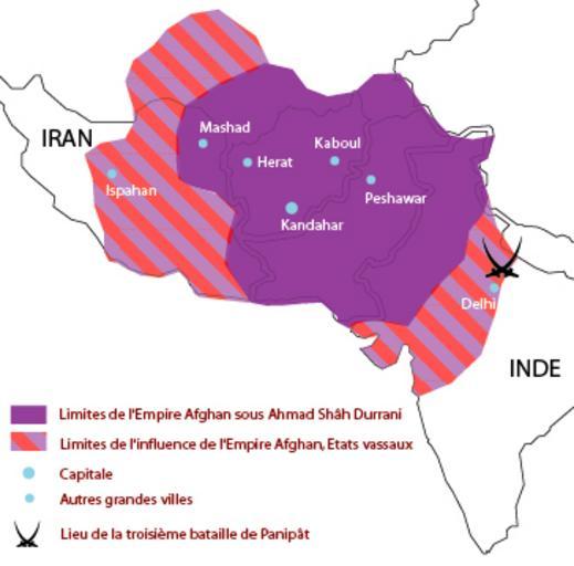 Keywords: Afgempdur.jpg Limites de l'Empire Afghan sous Ahmad Shah Durrani 23-12-2007 own 2007-12-23 Sayyed Ahmad Chekeb Hossainy Qods'Allah Détenteur du copyright est l'auteur du fichier carte historique Maps of the Durrani Empire Maps in French