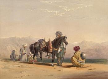 | Keywords: Afghan cavalry during 1839-42.jpg Jaunbauz or Afghan cavalry with horse bearing implements for smoking This lithograph is taken from plate 17 of 'Afghaunistan' by Lieutenant James Rattray He wrote Never were a wilder more devil-may-care set of fellows seen than the Afghan cavalry Known as Jaanbaz meaning 'life gamblers' the cavalry in the Shah's service often became mercenaries in the British army Heavily armed and very often professional robbers they became soldiers when it suited them said Rattray They take our service because we paid them well and regularly but a great deal of the savoir faire was required in the management of them He described them as naturally a restless and independent people and according to one of their own proverbs ready to bear hunger thirst cruelty and death but never - a master they by the same fate could not endure the discipline of our regulars The horse in the image has a box containing a Qalyan pipe and smoking equipment hanging from its saddle pommel with a pan of hot coals to light it slung under the horse's belly http //www bl uk/ The British Library - http //www bl uk/onlinegallery/onlineex/apac/other/019xzz000000562u00017000 html Online Gallery 1848 James Rattray 1818-1854 PD-Old PD-old-70 History of Afghanistan in art Men of Afghanistan in the 19th century Men of Afghanistan in art Military history of Afghanistan 1848 lithographs 19th-century cavalry - United Kingdom and the British Empire Irregular cavalry Cavalry of the Islamic World Clothing of Afghanistan |