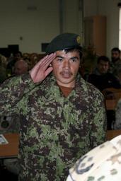 | Keywords: Afghan Forces graduate from IED-Defeat-EOD training 111215-N-XY282-126.jpg en An Afghan National Army soldier salutes his leadership during a graduation ceremony held at the Afghan National Army Engineer School near Camp Spann Dec 15 Fifteen Afghan servicemen graduated in the ceremony and can now wear the Explosive Ordnance Disposal patch and badge after completing 22 weeks of intensive EOD and Improvised Explosive Device Defeat training The Engineer School is the only one in Afghanistan that teaches the fundamentals of EOD and IEDD to Afghan National Security Forces International Security Assistance Force Regional Command North supports Afghan National Security Forces in close coordination and collaboration in providing security and disrupting the insurgents' activities in order to protect the population secure the highways and support the Afghan Border Patrol operations in the border areas and crossing points in order to set the conditions for economic social and cultural development in key terrain districts 2011-12-15 Petty Officer 1st Class Richard Wolff https //www dvidshub net/image/501585 111215-N-XY282-126 2011-12-19 08 37 MAZAR-E-SHARIF AF PD-USGov-Military-Navy Soldiers of the Afghan National Army Images from DoD uploaded by Fæ |