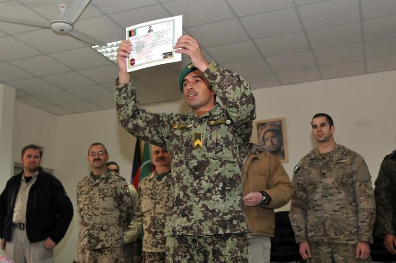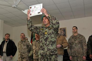 | Keywords: Afghan Forces graduate from IED-Defeat-EOD training 111215-N-CB888-006.jpg en An Afghan National Army soldier proudly displays his certificate during a graduation ceremony held at the Afghan National Army Engineer School near Camp Spann Dec 15 Fifteen Afghan servicemen graduated in the ceremony and can now wear the Explosive Ordnance Disposal patch and badge after completing 22 weeks of intensive EOD and Improvised Explosive Device Defeat training The Engineer School is the only one in Afghanistan that teaches the fundamentals of EOD and IEDD to Afghan National Security Forces International Security Assistance Force Regional Command North supports Afghan National Security Forces in close coordination and collaboration in providing security and disrupting the insurgents' activities in order to protect the population secure the highways and support the Afghan Border Patrol operations in the border areas and crossing points in order to set the conditions for economic social and cultural development in key terrain districts 2011-12-15 Chief Petty Officer Oscar Troncoso https //www dvidshub net/image/501566 111215-N-CB888-006 2011-12-19 08 23 MAZAR-E-SHARIF AF PD-USGov-Military-Navy Soldiers of the Afghan National Army Images from DoD uploaded by Fæ |