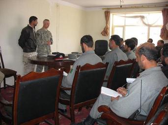 | Keywords: Afghan National Police graduate new leaders DVIDS40573.jpg en Army Spc Ethan Smith 201st Military Police Company 1st Platoon teaches a radio communications class to Afghan national police leaders during a Afghan Leadership Skills Seminar April 4 Police chiefs from seven districts across the Kapisa Province received classroom instruction on ethics/values leadership community policing map reading running a tactical operations center basic communication hygiene and logistics Completion of this course made them the first Afghan police leaders to complete this type of training U S Air Force photo by Staff Sgt Oshawn Jefferson 2007-04-04 https //www dvidshub net/image/40573 40573 2007-04-05 14 32 BAGRAM AIR FIELD AF PD-USGov Bagram Air Base Images from DoD uploaded by Fæ |