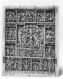 | Keywords: Afonasii Isakov - "In Thee Rejoices," Feast Scenes, and Saints - Walters 71261.jpg The central scene of this ivory represents the composition In Thee Rejoiceth based on a liturgical hymn that exhorts all of creation to sing praises to the Virgin Mary is shown enthroned in Paradise holding her son Jesus and surrounded by angels Below the faithful are offering her their praise The image is framed by scenes corresponding to the twelve major feasts of the Orthodox Church the Holy Trinity represented as the three angels that appeared to Abraham at Mamre Annunciation Nativity Presentation of Christ in the Temple Baptism Transfiguration Entry into Jerusalem Raising of Lazarus Crucifixion Resurrection Ascension Pentecost and Dormition Death of the Virgin Saints Basil and Gregory are depicted in the lower left and right corners On the back are Saints Nicholas Athanasius and Sergius of Radonezh ; Saint George killing the dragon; Prophet Isaiah Saint Ambrose Saints Stephen and Nicetas; Saints Catherine Barbara and Parascheve Small panels of the present kind were used as personal prayer images and this one carries in the lower frame the name of its original owner Athanasius Isaacovich Olgov century 17 Early Modern ivory cm 7 5 6 1 accession number 71 261 7922 Henry Walters city Baltimore Walters Art Museum Henry Walters Acquired by Henry Walters 1931 Translation on the face In thee rejoiceth O Full of Joy all creation on the back in the lower frame Belongs to Athanasius son of Isaac Olgov A Millennium of Christianity Russian Art from The Walters Art Gallery The Walters Art Gallery Baltimore 1988-1989 place of origin Russia Walters Art Museum license Russian art in the Walters Art Museum Carved ivory objects Virgin Mary Eastern Orthodoxy Holy Trinity Reliefs of Christian saints in Russia Media contributed by the Walters Art Museum needs artist review Reliefs of angels |
