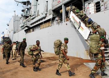 | Keywords: Africa Partnership Station Returns to Gabon DVIDS79112.jpg en Students from the Gabonese military arrive onboard the amphibious dock landing ship USS Fort McHenry LSD 43 for training with Africa Partnership Station APS at Port Gentile Gabon These students plan to receive training in various APS topics such as pier and waterside sentry specialized medical training and maritime law Part of the U S Navy's Global Fleet Station APS provides a platform with the capacity and persistent presence to support sustained focused training and collaboration on a regional scale to maritime partners in West and Central Africa Commander Task Force 365 and training teams from various U S and European military commands as well as governmental and non-governmental organizations are embarked on board Fort McHenry to enhance cooperative partnerships U S Navy photo/Petty Officer 2nd Class R J Stratchko 2008-03-03 Petty Officer 2nd Class RJ Stratchko https //www dvidshub net/image/79112 080303-N-+++++-028 2008-03-03 16 39 PORT GENTILE GA PD-USGov-Military-Navy USS Fort McHenry LSD-43 Images from DoD uploaded by Fæ |